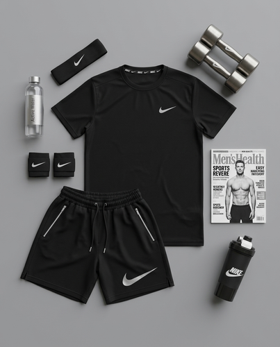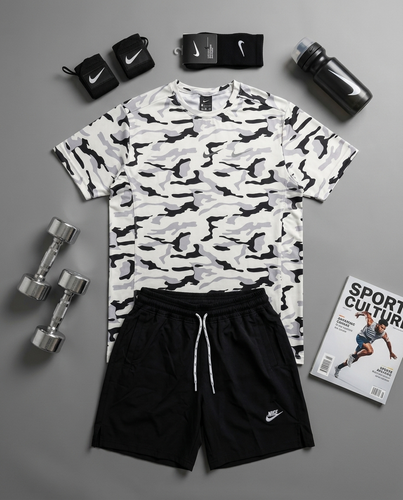 پکیج کد E1978 شامل تیشرت + شلوارک + شیکر دو تیکه + مچبند چسب نانو + جوراب ساقدار + هدبند با تم مشکی 😍🔥