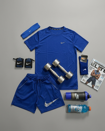 پکیج کد E1986 شامل تیشرت + شلوارک + شیکر دو تیکه + مچبند چسب نانو + جوراب ساقدار + هدبند با تم آبی 😍🔥