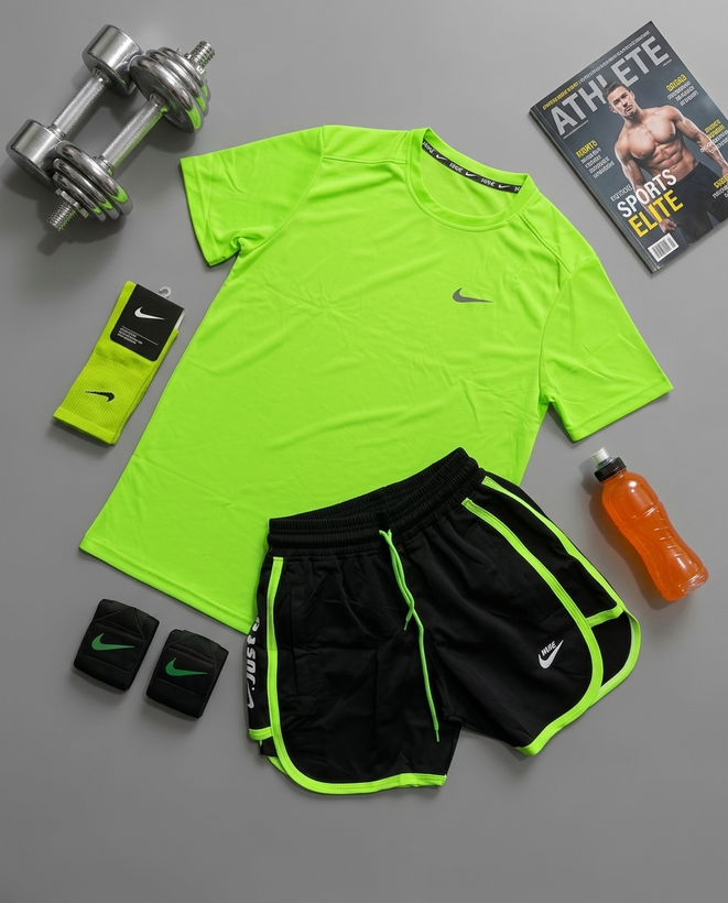 پکیج کد E1939 شامل تیشرت + شلوارک + جوراب ساقدار + مچبند چسب نانو با تم فسفری 💚😎