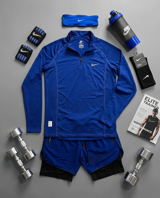 شامل تیشرت آستین بلند نیم زیپ + شلوارک کشاله دار + هدبند + شیکر دو تیکه + مچ بند چسب نانو + جوراب با تم آبی 💙🔥