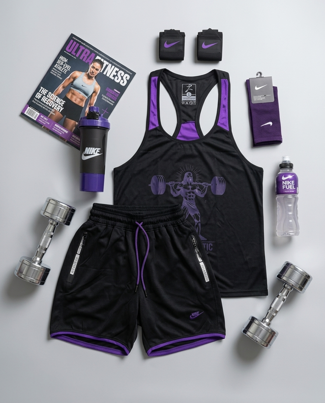 شامل رکابی قهرمانی + شلوارک + جوراب ساقدار + شیکر دو تیکه + مچ بند چسب نانو با تم مشکی بنفش 💜🖤