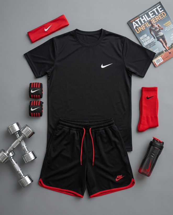 پکیج کد E1974 شامل تیشرت + شلوارک + هدبند + مچ بند چسب نانو + جوراب ساقدار با تم نوک مدادی مشکی 🖤🔥