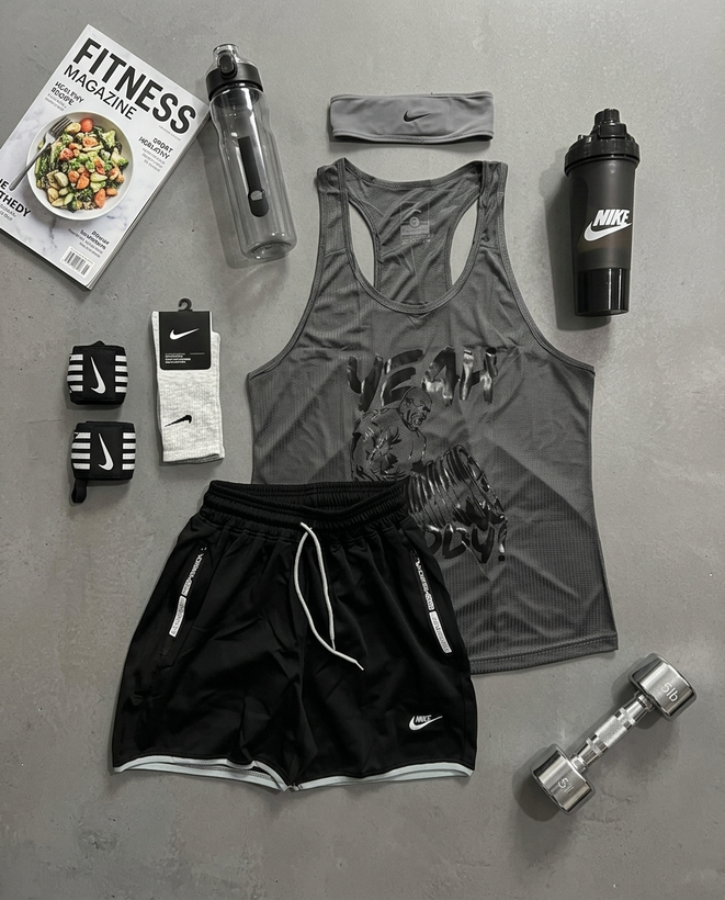 پکیج کد E1985 شامل رکابی قهرمانی + شلوارک + جوراب ساقدار + شیکر دو تیکه + مچ بند چسب نانو + هدبند با تم طوسی مشکی 🖤🔥