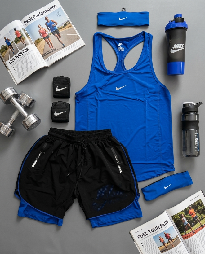 شامل رکابی قهرمانی + شلوارک کشاله دار + جوراب ساقدار + شیکر دو تیکه + مچ بند چسب نانو + هدبند با تم آبی مشکی💙😎