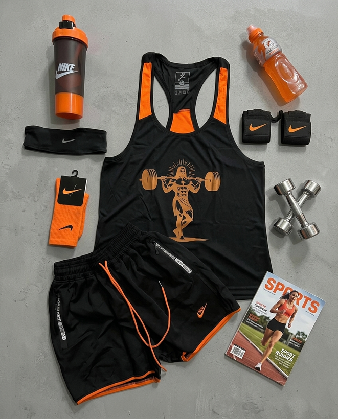 ست باشگاهی شامل رکابی حلقه ای + شلوارک + جوراب ساقدار + شیکر دو تیکه + مچ بند چسب نانو + هدبند با تم مشکی نارنجی 🖤🧡پکیج کد E2024