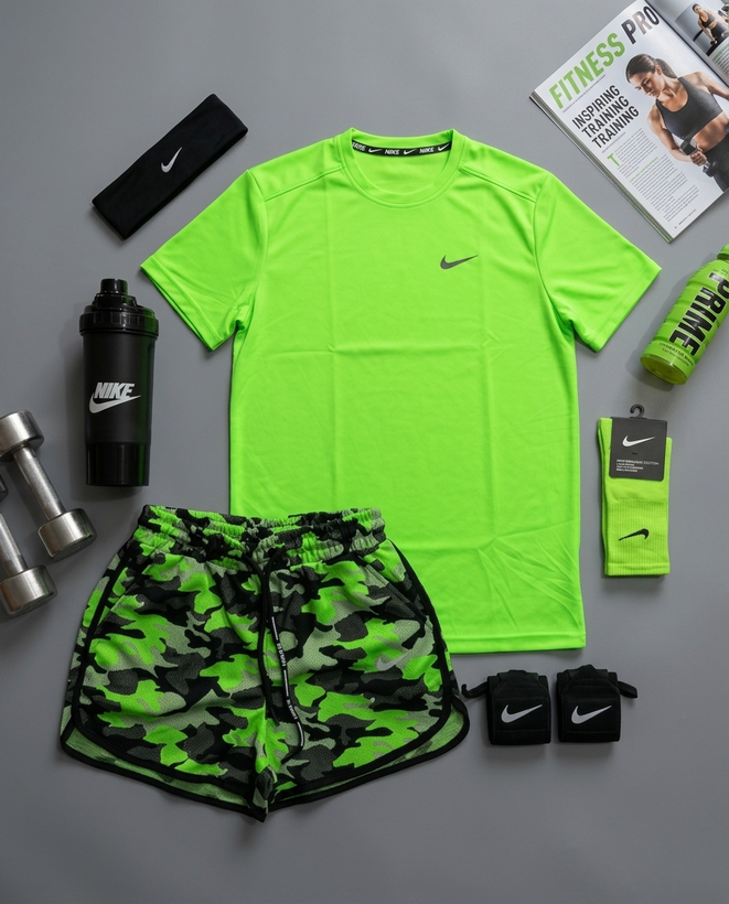 شامل تیشرت + شلوارک + جوراب ساقدار + شیکر دو تیکه + مچ بند چسب نانو + هدبند با تم فسفری 💚🔥