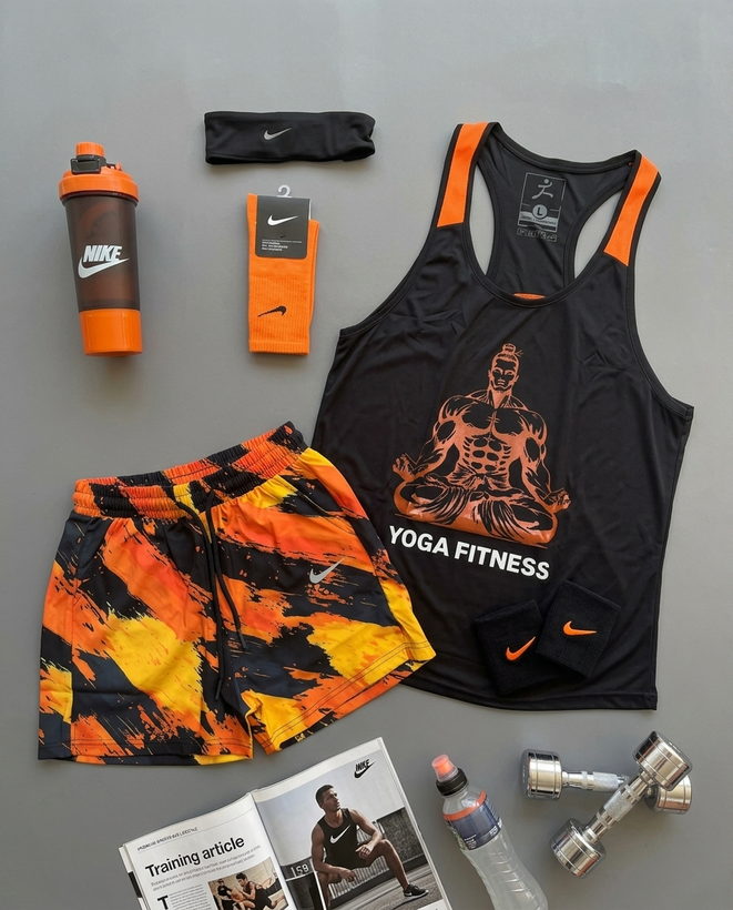 ست اسپرت شامل رکابی قهرمانی + شلوارک + جوراب ساقدار + شیکر دو تیکه + هدبند با تم مشکی نارنجی 🖤🧡پکیج کد E2026