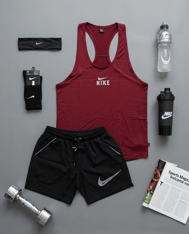 ست باشگاهی رکابی قهرمانی + شلوارک + جوراب ساقدار + شیکر دو تیکه + هدبند با تم زرشکی مشکی 🖤❤️ پکیج کد E2034
