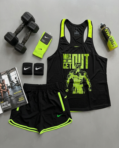 پکیج کد E1915 شامل رکابی قهرمانی + شلوارک + جوراب ساقدار + شیکر دو تیکه + مچ بند چسب نانو + هدبند با تم فسفری مشکی 💚🖤