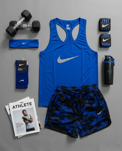 پکیج کد E1965 شامل تیشرت + شلوارک + هدبند + شیکر دو تیکه + مچ بند چسب نانو + جوراب با تم آبی 💙🔥