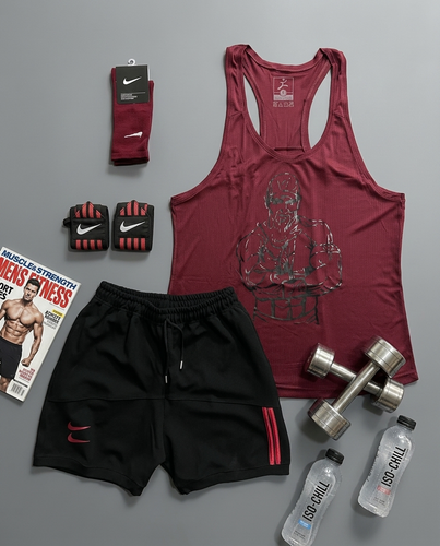 پکیج کد E1920 شامل رکابی قهرمانی + شلوارک + جوراب ساقدار + مچ بند چسب نانو با تم مشکی زرشکی🔥🖤