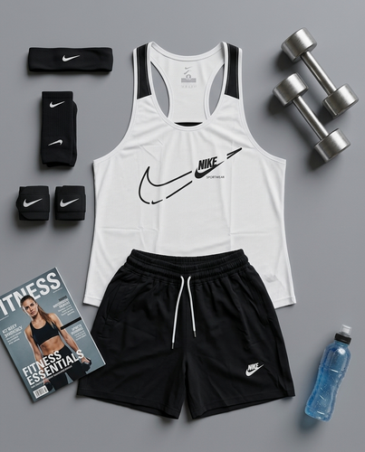 پکیج کد E1931 شامل رکابی قهرمانی + شلوارک + جوراب ساقدار + مچ بند چسب نانو + هدبند با تم سفید مشکی 🤍🖤