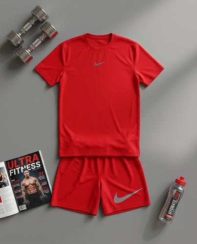 پکیج کد E1914 شامل تیشرت + شلوارک + جوراب ساقدار + مچ بند چسب نانو + هدبند با تم قرمز 🔥❤️