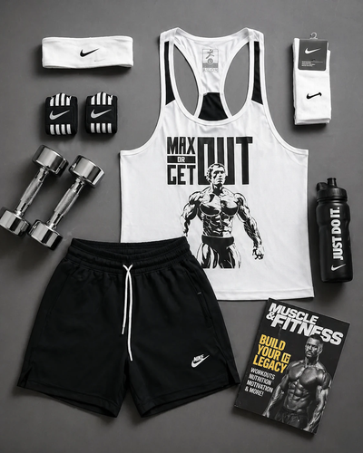 پکیج کد E1948 شامل رکابی قهرمانی + شلوارک + جوراب ساقدار + شیکر دو تیکه + مچ بند چسب نانو + هدبند با تم سفید مشکی 🔥🤍