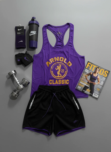 پکیج کد E1958 شامل رکابی قهرمانی + شلوارک + جوراب ساقدار + شیکر دو تیکه + مچ بند چسب نانو با تم بنفش مشکی💜🖤