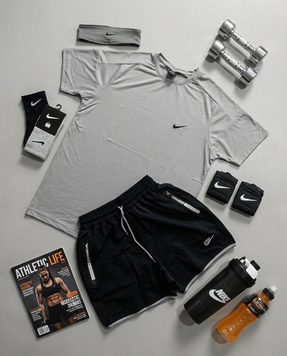پکیج کد E1959 شامل تیشرت + شلوارک + شیکر دو تیکه + مچبند چسب نانو + جوراب ساقدار + هدبند با تم طوسی مشکی 😍🔥