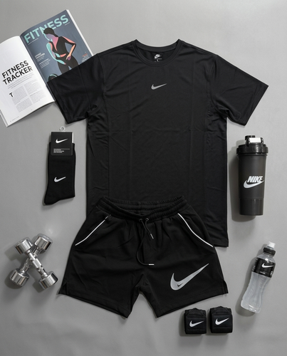 پکیج کد E1962 شامل تیشرت + شلوارک + شیکر دو تیکه + مچبند چسب نانو + جوراب ساقدار با تم مشکی 😍🔥