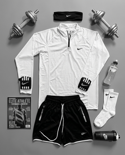 پکیج کد E1964 شامل تیشرت آستین بلند نیم زیپ + شلوارک + هدبند + شیکر دو تیکه + مچ بند چسب نانو + جوراب با تم سفید 🤍🔥